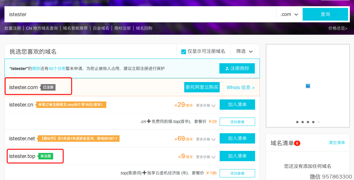 4. 建议选择.com的域名,比如咱们的网站 isTester.com